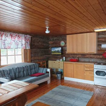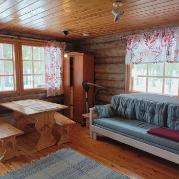 Kitchenette with cookware, cooker, microwave and fridge. A fireplace in the living room, where you can also prepare your own food. Electric heating, TV and Wi-Fi. In the sauna, wood heating, water from the lake. Outdoor toilet. Spacious outdoor terrace for your enjoyment.