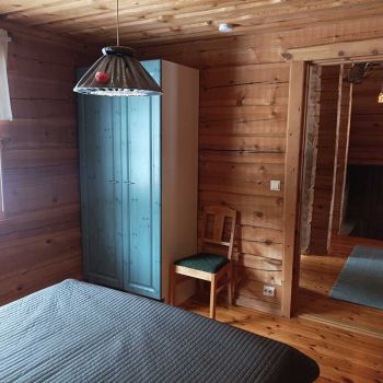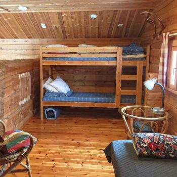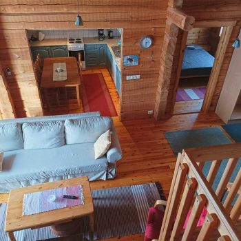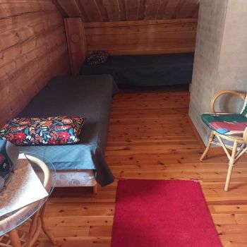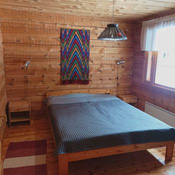 Spacious 80 m2, of which 13 square meters in the loft. Customers love the floor plan, with sauna facilities and toilet half floor below the loft. Open plan living room, kitchen, bedroom, wood burning sauna, shower and indoor toilet.